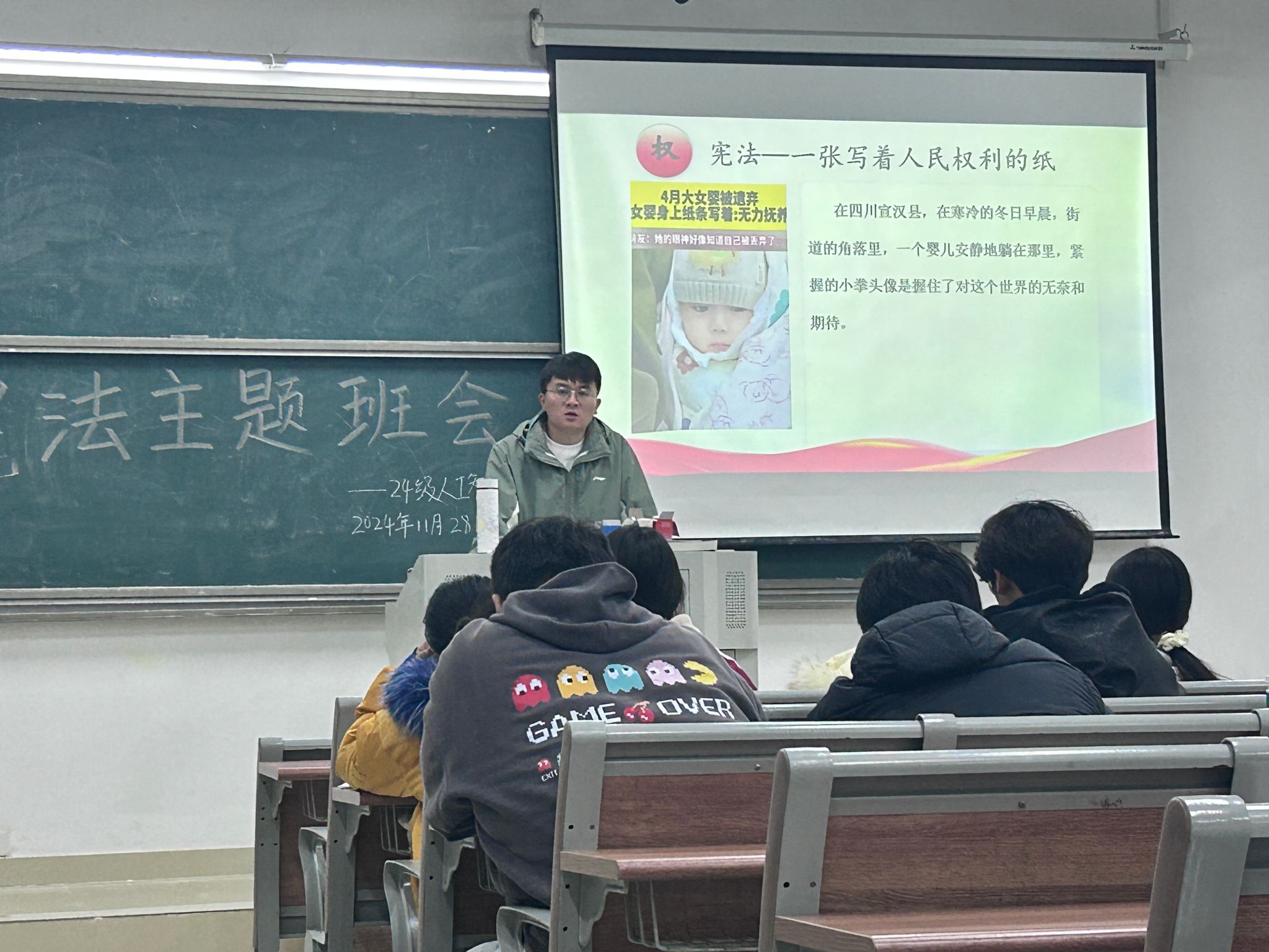 12月4日是我国第十个国家宪法日,为全面贯彻落实党的二十大精神,深入学习宣传习近平法治思想和习近平文化思想,增强全社会的宪法意识,弘扬宪法精神,维护宪法尊严,加强学生的法治意识,推动宪法的宣传和普及工作,全体辅导员组织各班召开“与法同行——争做学法守法护法时代新人”主题班会。