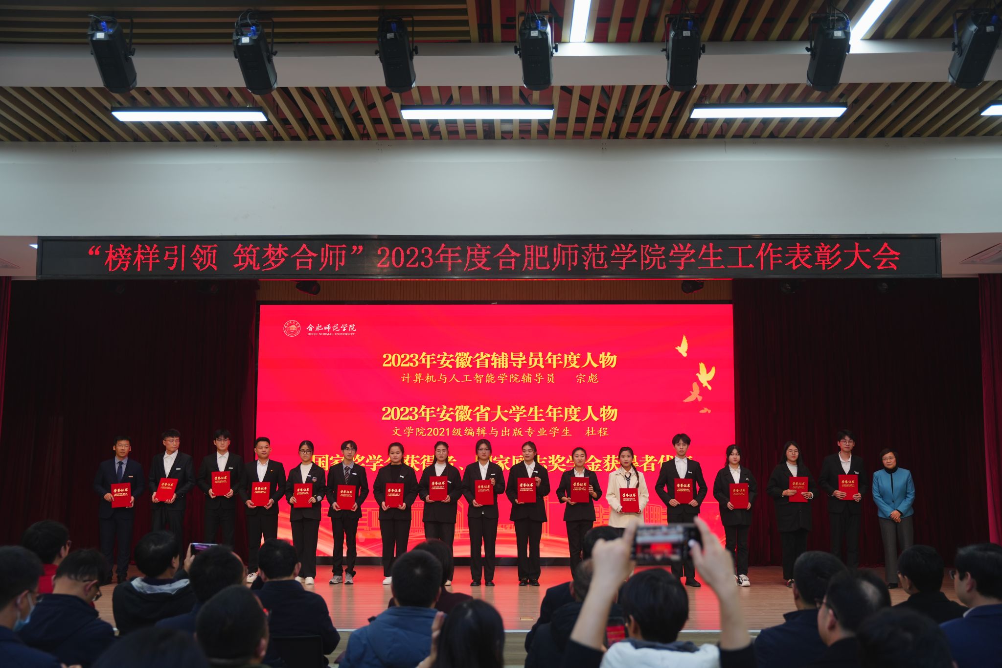 2023年度安徽省大学生年度人物、文学院2021级编辑与出版专业杜程,学院2022年度优秀辅导员、电子信息与集成电路学院辅导员周玉,学院2023年度十佳优良学风班级、生物与食品工程学院2021级生物制药专业陈晴,作为获奖集体和个人代表发言,表示将珍惜荣誉、接续奋斗,为学院全面建成特色鲜明的地方应用型高水平大学而不懈奋斗。