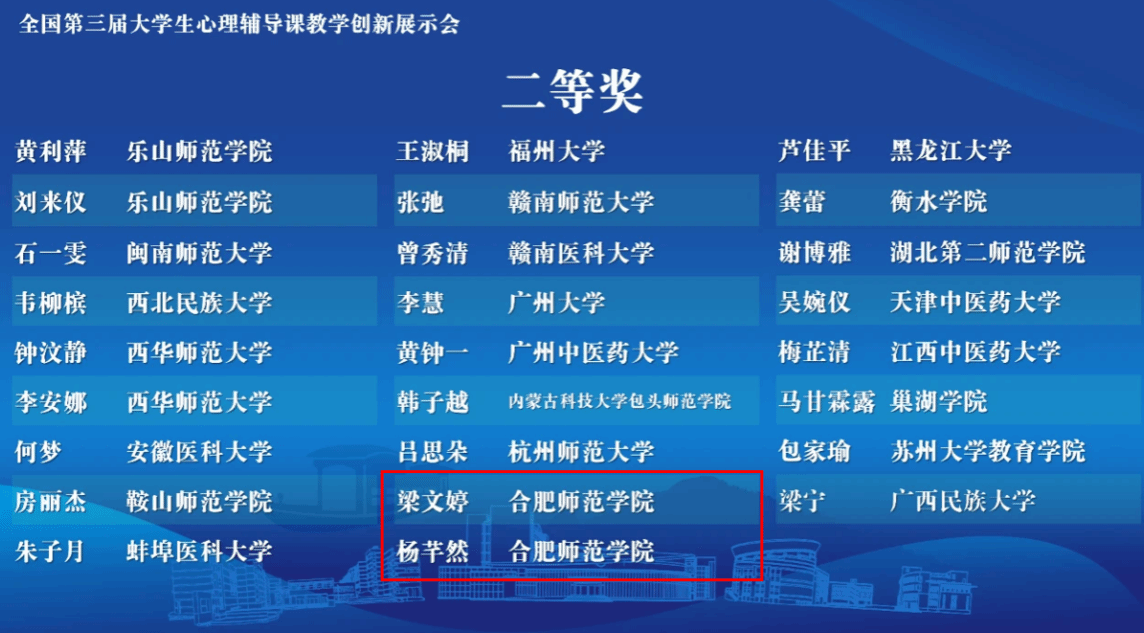 据悉,2024年以来,心理学系师生深度参与专业赛事,在3月份举行的安徽省首届心理学专业本科生创新创业论坛上斩获一等奖5个,二等奖3个,三等奖3个,一等奖数量居参赛院校首位。学院以“应用心理”高峰培育学科建设为契机,鼓励教师将教科研成果转化服务于教学,在有效提升人才培养质量的同时对接社会需求。(教育与心理科学学院:吴皖赣、陈庆华、杨芊然、梁文婷)