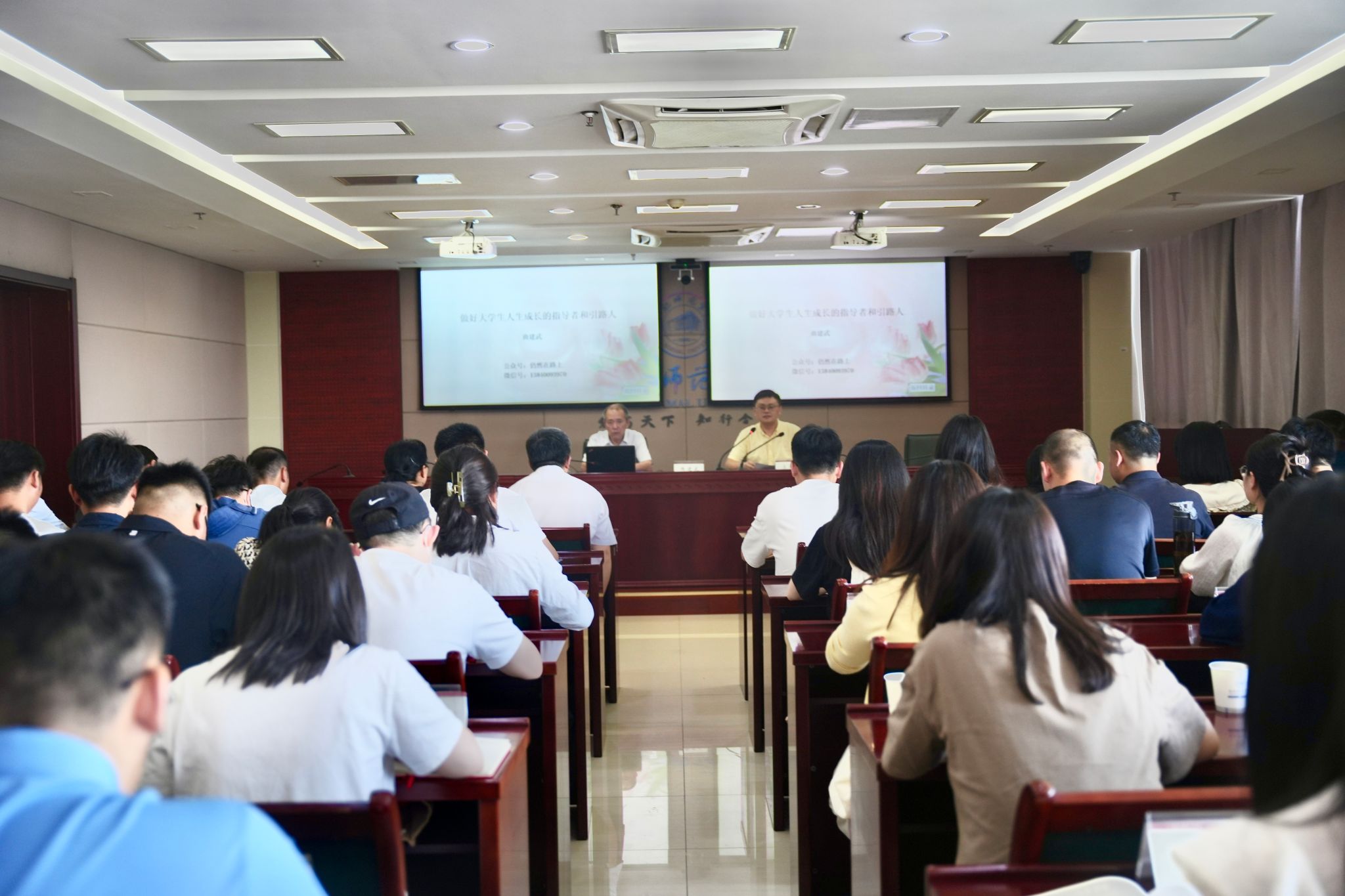 报告会在行知楼2011会议室举办,各二级学院党委副书记及全体辅导员参加了本次报告会,报告会由学生工作部部长刁文彬主持。曲建武以《做好大学生人生成长的指导者和引路人》为题,结合自己四十余年的学生工作经历,从“不忘初心使命”和“倾力铸魂育人”两个方面,讲述了自己教育引导帮扶学生的感人经历。通过一幅幅珍贵照片、一段段感人事迹、一系列名言名句,用亲身经历,通过生动、鲜活、催人泪下的事例为大家讲述了如何做好一名爱岗敬业、爱生如子的辅导员的心路历程,生动诠释了辅导员工作的重要使命与责任担当,诠释了一名思想政治工作者的为党育人、为国育才的初心使命。他勉励广大辅导员,要自觉把自身工作与党和国家的伟大事业联系起来,坚定理想信念,积极担当作为,始终牢记自己的使命和责任,把思想政治教育工作当成一生为之奋斗的崇高事业,在服务学生中实现人生价值。