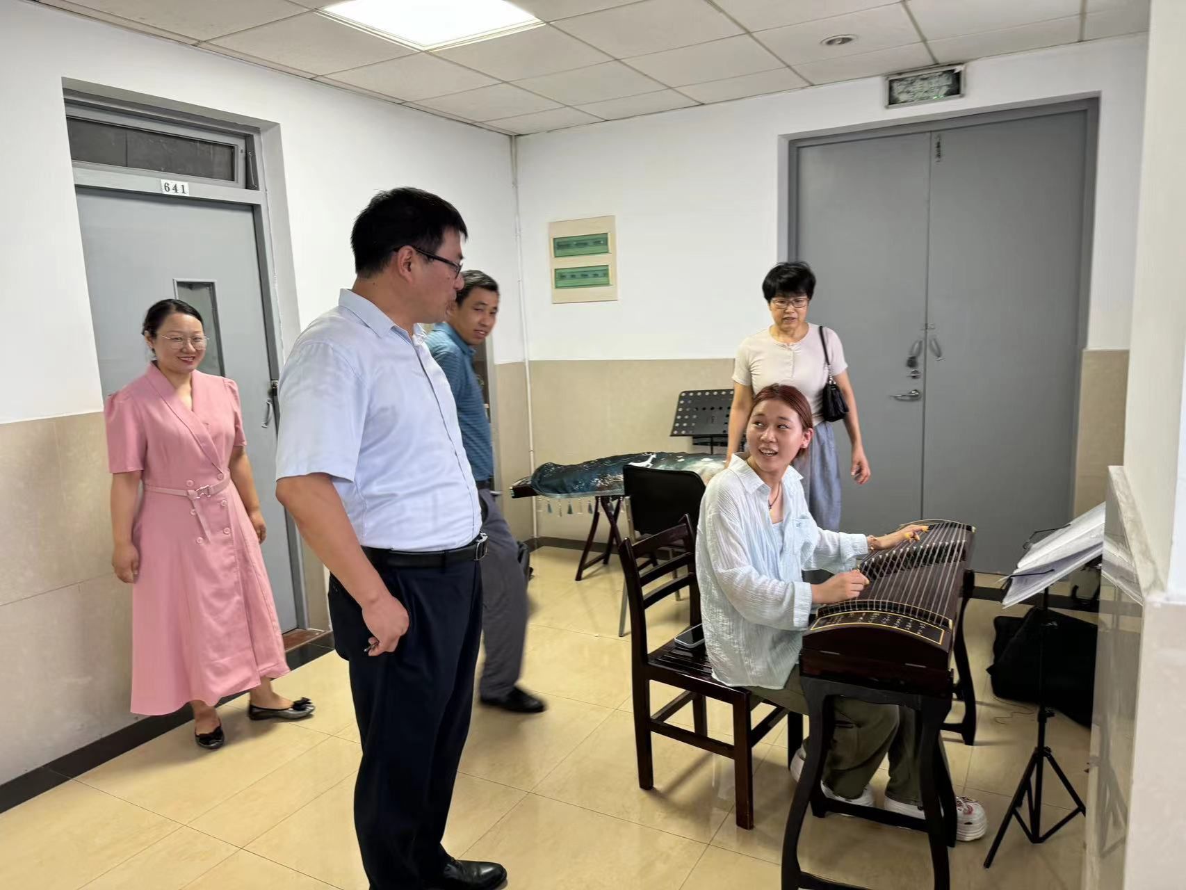 9月11日,党委委员、副院长周端明教授来到音乐学院音乐楼调研了解教学设备管理与使用情况。音乐学院党委书记蔡成梅、党委副书记宋辉、副院长康勤等全程陪同调研。