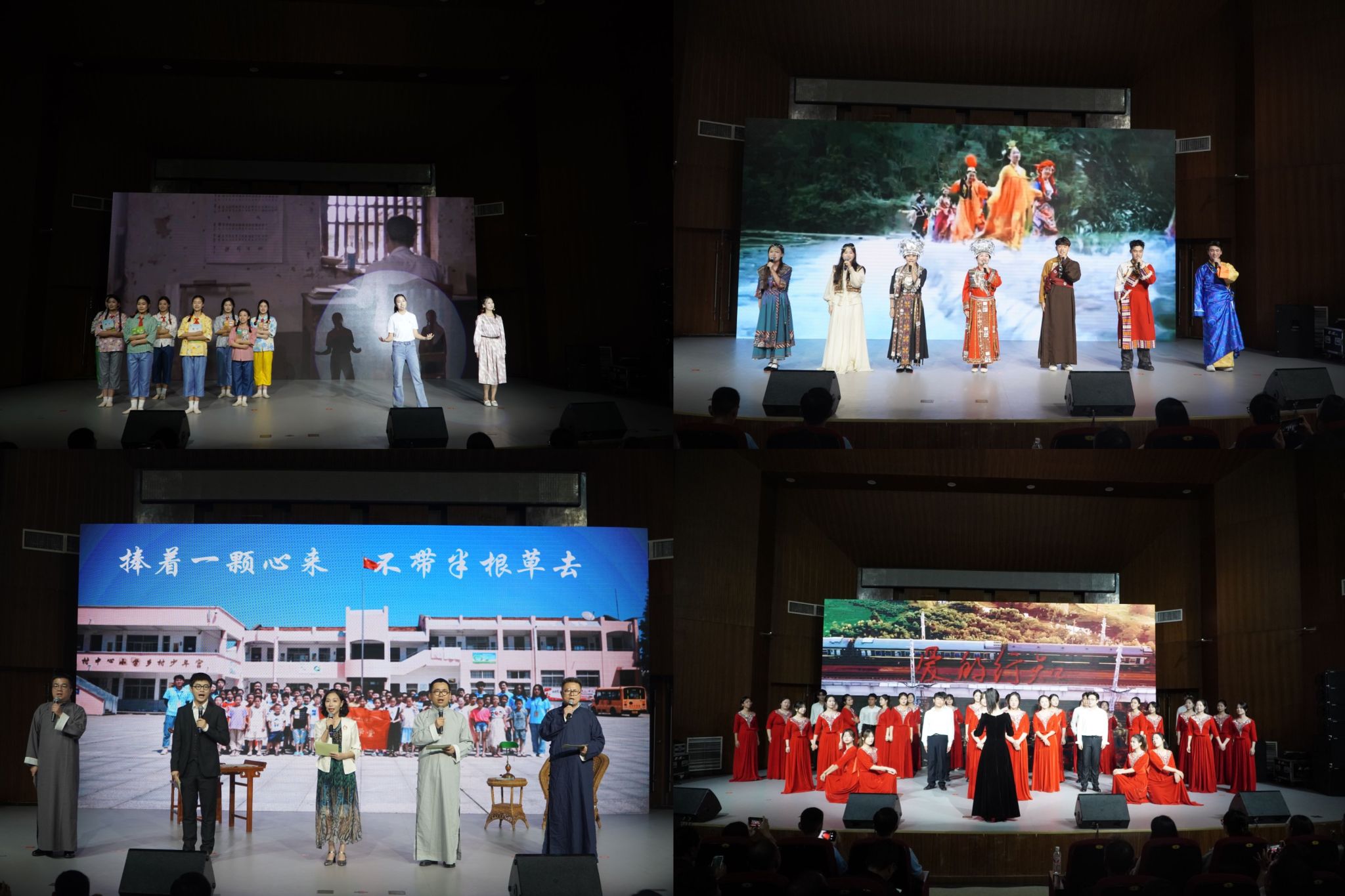 晚会在音乐学院带来的器乐合奏《花好月圆》中拉开帷幕。院团委学生组织的朗诵《陶风尽起,盈车嘉穗》展示了合师学子立志“学陶师陶”,积极学习践行陶行知教育思想的坚定决心;音乐学院的歌曲《老师我总是想起你》《长大后我就成了你》唱出了合师人“两代师表”的教育传承,表达出学生对老师的怀念与感激之情;教育与心理科学学院的原创音乐剧《燃灯远山 守望未来》讲述了合师学子赴山区支教难舍师生情,最终选择留在大山里陪伴学生的感人故事,阐释了“爱满天下,知行合一”的校训内涵;音乐学院学子以精湛的演唱技巧用《爱我中华》倾情表现全国各族人民对祖国母亲的热爱;教工青轻读书社带来的《捧着一颗心来,不带半根草去》以情景剧形式全景介绍了陶行知先生生平事迹和教育思想;校团委大学生艺术团合唱行知学堂原创主题曲《爱的行知》通过歌声传递行知学堂的理念和精神,合唱《我的祖国》唱出对祖国母亲的无限眷恋和祝福之情。晚会在全场大合唱《歌唱祖国》中画上了圆满句号。