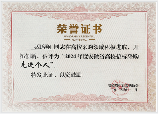1月3日,安徽省招标采购协会第三届理事会第五次(扩大)会议暨2024年度安徽省高校采购论坛在合肥召开,来自全省的高校代表以及采购代理机构参加会议。安徽省财政厅、教育厅和安徽省招标采购协会有关领导出席会议并讲话。本次会议对2024年度高校招标采购先进集体、先进个人进行了表彰,我校被授予“2024年度安徽省高校招标采购先进集体”荣誉称号,资产管理处(招标办)赵鹏翔荣获“2024年度安徽省高校招标采购先进个人”。