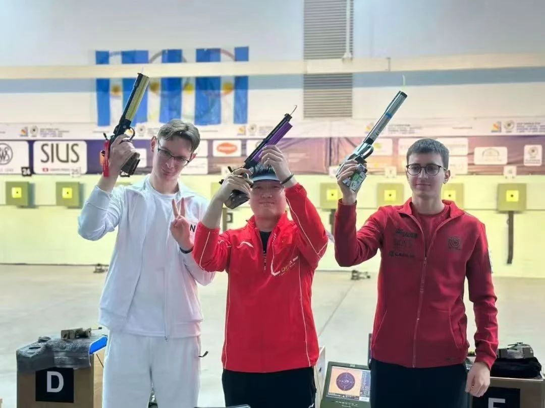 4月3日-10日,2025年国际射联世界杯阿根廷布宜诺斯艾利斯站在阿根廷举办。我校体育科学学院2021级体能训练专业学生、安徽省射击运动管理中心现役运动员胡凯在男子10米气手枪比赛中以244.7环摘得金牌。这是胡凯个人职业生涯收获的首枚世界杯金牌,也是中国步手枪射击队在2025年获得的首枚国际赛事金牌。在气手枪混合团体金牌争夺战中,胡凯与姚千寻组合不敌国家队队友,收获银牌,在本站世界杯上,收获1金1银的好成绩。
