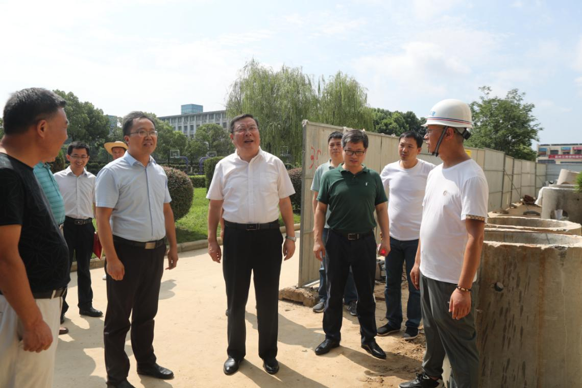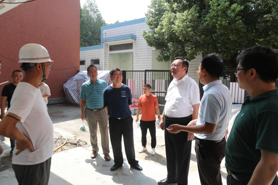 本网讯 7月31日上午,党委书记徐成钢,党委委员、副校长华银峰顶着烈日在锦绣校区各暑期施工现场检查指导工作。党政办、后勤处(基建办)、保卫处等部门负责人及现场工作人员陪同检查。