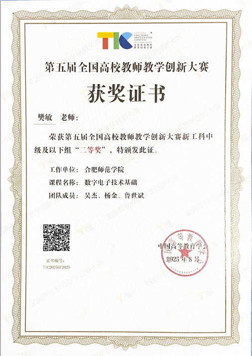 8月19日,由教育部高等教育司指导、中国高等教育学会主办的第五届全国高校教师教学创新大赛全国现场赛在北京理工大学落下帷幕。这是唯一一项纳入教育部“三评一竞赛”清单的本科高校教师教学竞赛活动,被誉为“教师教学竞赛中的奥林匹克”。我校电子信息与集成电路学院樊敏老师《数字电子技术基础》教学团队,以新颖的教学设计和良好的实施效果,在比赛中脱颖而出,荣获新工科中级及以下组二等奖。这是我校教师首次在此项赛事国赛中获奖,实现历史性突破。