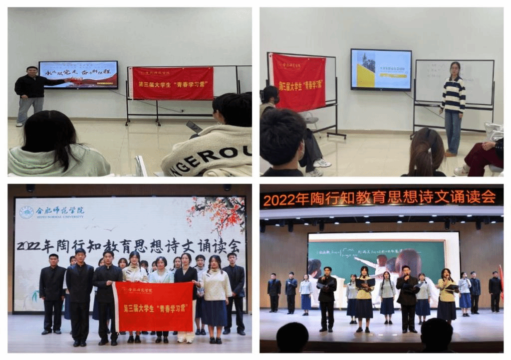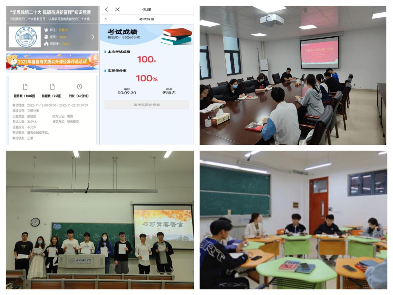 二是特色活动见实绩。开展党的二十大精神学习会暨个人规划交流会,围绕“学习二十大,做好人生规划”主题展开热烈讨论,增强了同学们的时代感责任感,丰富了同学们对大学的认知,明确了将未来规划与党和国家事业发展、社会进步相结合的重要目标,坚定了“不忘初心跟党走,青春建功新时代”的誓言。参演学院2022年陶行知教育思想诗文朗诵会,传递“学做真人,点亮青春”的青春目标。