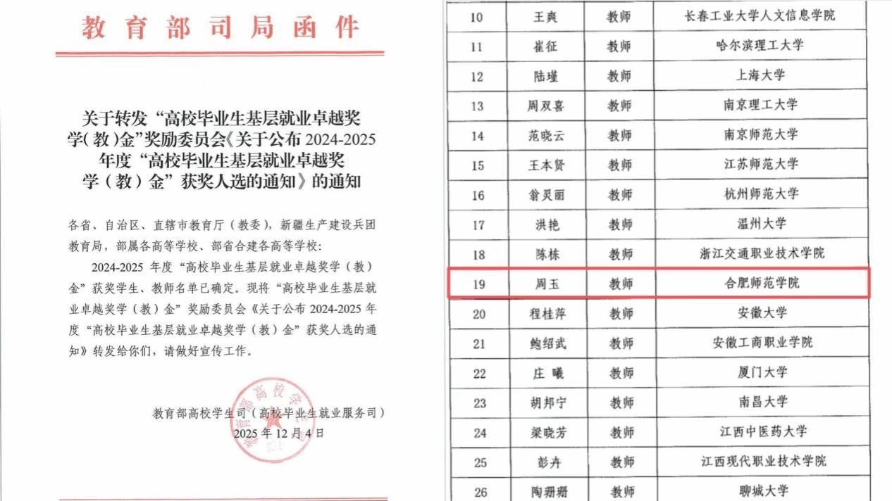 我校辅导员周玉荣获教育部“高校毕业生基层就业卓越奖教金”