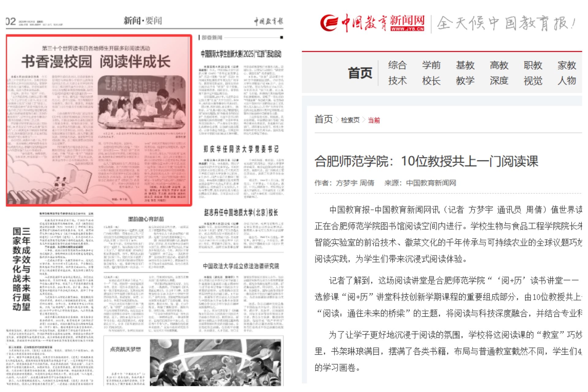 涵养书香校园,培育阅读品牌。4月23日世界读书日,图书馆阅读空间内座无虚席,一场“可尝、可思、可创”的阅读讲堂正在进行。这是我校“‘阅+历’读书讲堂——‘科创十讲’”的内容,也是通识选修课“阅+历”讲堂科技创新学期课程的重要组成部分。《中国教育报》、中国教育新闻网、安徽日报、合肥在线等多家主流媒体以《10位教授同上一门阅读课》为主题,报道了我校“阅+历”讲堂线下精品通识选修课这一特色文化品牌。