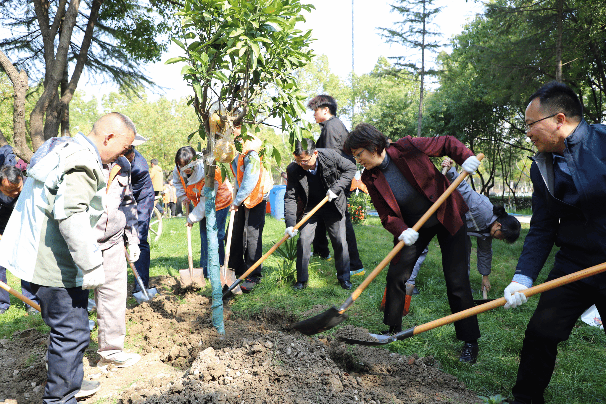3月12日,“绿满锦绣,植此同行”植树节主题活动在锦绣校区樟树林、行知广场桃李园温情启幕。党委副书记、校长方东玲,党委委员、副校长、组织部部长赵帮恚来到现场,与宣传部、团委、后勤处(基建办)、学生志愿者以及阡陌物业工作人员一道,躬身挥锹、共植新绿,以实干践行生态责任,用温情浇灌校园希望。