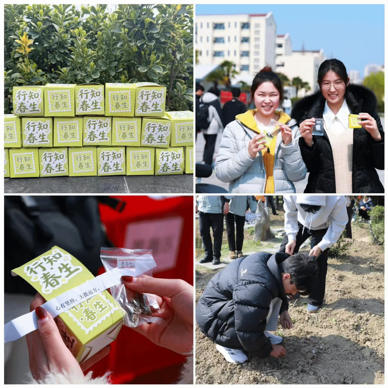 活动当天中午,工作人员在食堂前广场提前开展预热活动,向学生发放“行知·春生”种子盲盒,盲盒内装有各类花种、草种,让绿色希望提前传递,进一步激发了学生参与植绿护绿的热情,让植绿理念深入人心。