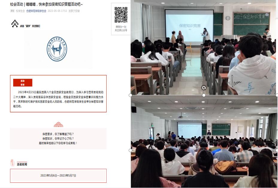 活动通过线上线下相结合的方式举办了2023年保密知识竞赛,共计700余人参加。500余名同学通过院学生会微信公众号线上答题,200余名同学在滨湖校区博学楼A108教室参加现场竞赛,活动分为游戏答题和常规答题,新颖有趣的比赛形式吸引了现场观众以及参赛选手的热情互动。参赛同学纷纷表示,参加这样的活动意义重大,在今后的学习和工作生涯中,将更加重视保密工作,使保守国家秘密成为自觉行动。最终决出一等奖2名、二等奖6名、三等奖10名。
