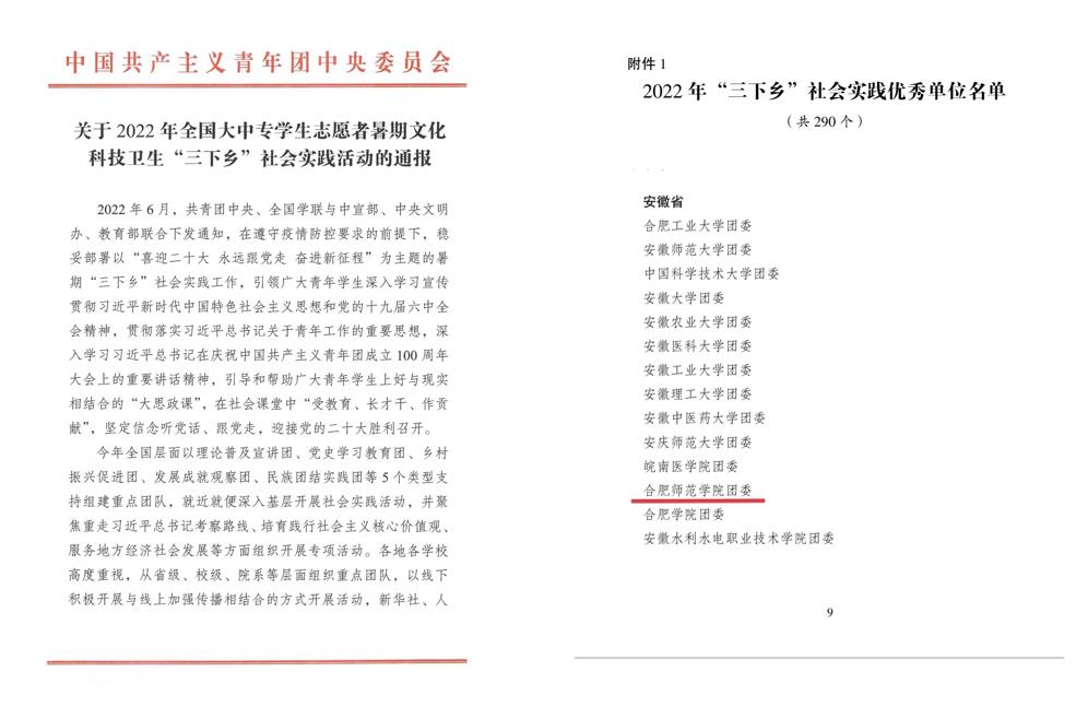又讯,省委宣传部、省文明办、教育厅、团省委、省学联近日联合公布了2022年安徽省大中专学生志愿者暑期“三下乡”社会实践活动评选结果,我院获得多项表彰。六安霍邱实践团、格物思维科普服务队、“同读团史 寻迹百年”社会实践团3支团队获评2022年全省大中专学生志愿者暑期“三下乡”社会实践活动优秀实践团队;院团委钟树旺、姚瑶2名教师获评2022年全省大中专学生志愿者暑期“三下乡”社会实践活动优秀个人;获评2022年全省大中专学生志愿者暑期“三下乡”社会实践活动优秀调研报告一等奖2个、二等奖1个、优秀奖1个;在2022年长三角高校大学生暑期社会实践专项活动评比中,获评优秀团队1个、优秀调研报告1个,获奖数量和质量均位居全省高校前列。(院团委)