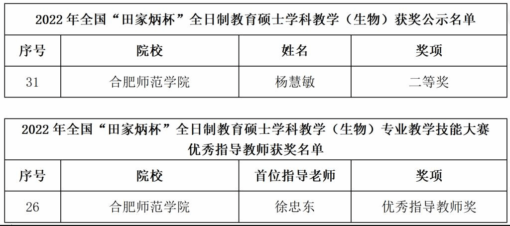 本网讯 近日,由浙江师范大学承办的全国“田家炳杯”全日制教育硕士专业学位研究生学科教学(生物)专业教学技能大赛决赛落下帷幕。经过激烈的角逐,我院生命科学学院2021级学科教学(生物)研究生杨慧敏同学荣获二等奖,徐忠东老师获优秀指导教师奖。