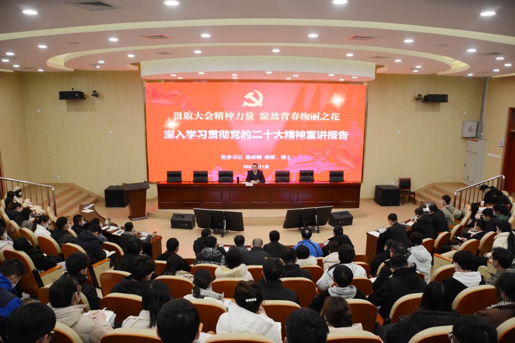 徐成钢以“汲取大会精神力量 绽放青春绚丽之花——深入学习贯彻党的二十大精神”为题,结合自身学习体会,从党的二十大的基本情况、深刻领会党的二十大的重大意义、准确把握党的二十大精神实质、以党的二十大精神为指引,全面推进学校高质量内涵式发展等方面进行了全面、深入、系统、有针对性的宣讲。
