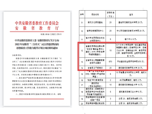 抓组织领导,健全体制机制。学校印发《关于加强和改进思想政治工作的实施方案》,明确了思想政治工作的指导思想、基本要求、目标任务和保障措施,深化理想信念铸魂等“十大工程”。制定《beat365唯一官方网站贯彻落实〈关于加快构建高校思想政治工作体系的意见〉工作台账》,推进落实各项举措,形成思想政治工作合力,提升育人成效。获批安徽省“三全育人”综合改革试点“1+3”项目,并先后通过中期评估验收。