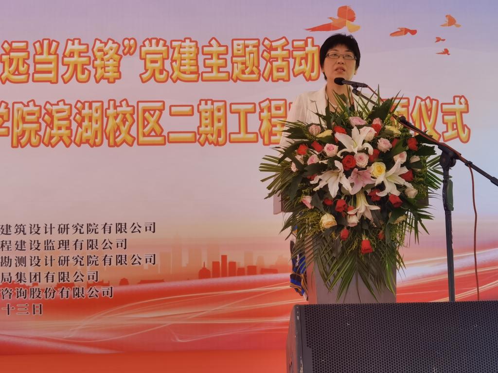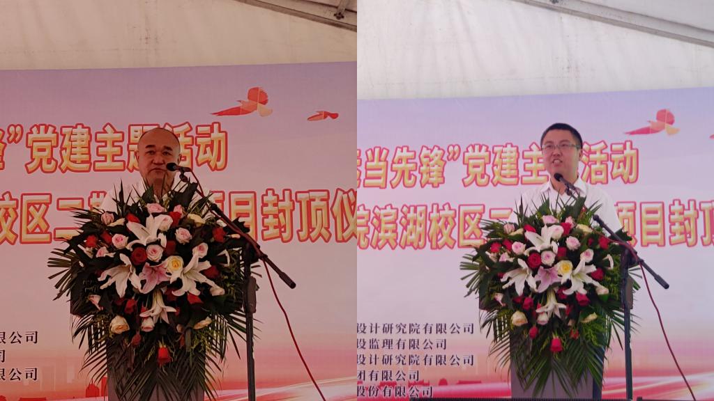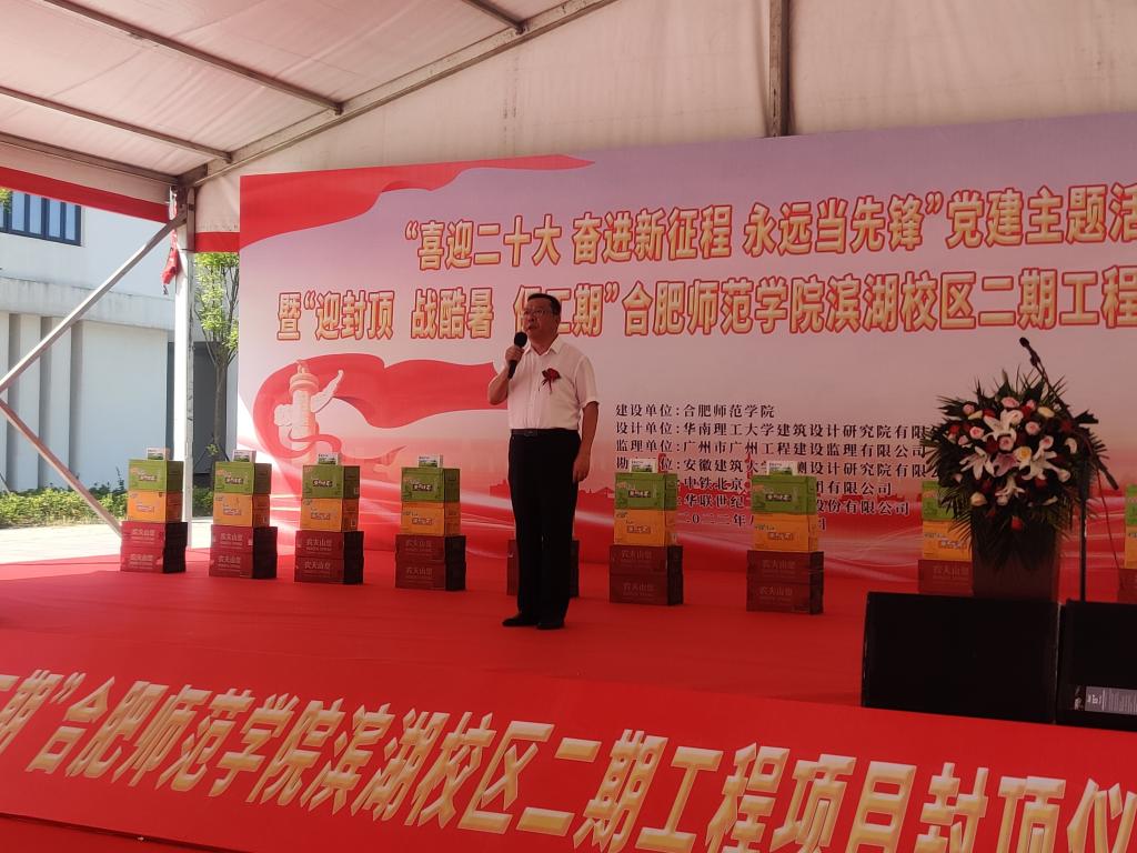 党委副书记、院长方东玲发表热情洋溢的讲话,对项目主体结构的顺利封顶表示热烈的祝贺,向全体建设者致以诚挚的慰问。她指出,工程启动以来,施工、监理、设计、审计等参建单位发扬艰苦奋斗的优良作风,齐心协力、攻坚克难,积极开展各项建设工作;学院各职能部门以强烈的主人翁意识,通力协作、担当作为,认真开展管理服务工作。她强调,全部单体顺利封顶后,二期工程将进入外墙粉饰、室内装饰、管网布局、绿化景观等施工新阶段,希望各参建单位继续发扬苦干实干作风,进一步加强安全管理,优化工程质量,加快施工进度,携手打造“社会满意、师生放心”的百年工程,确保二期工程如期建成投入使用。学院将以建好用好滨湖校区为新动力,凝心聚力、乘势而上,奋力推进硕士学位授予单位建设和创建合肥师范大学,加快提升服务区域经济社会发展能力,以优异成绩迎接党的二十大胜利召开。
