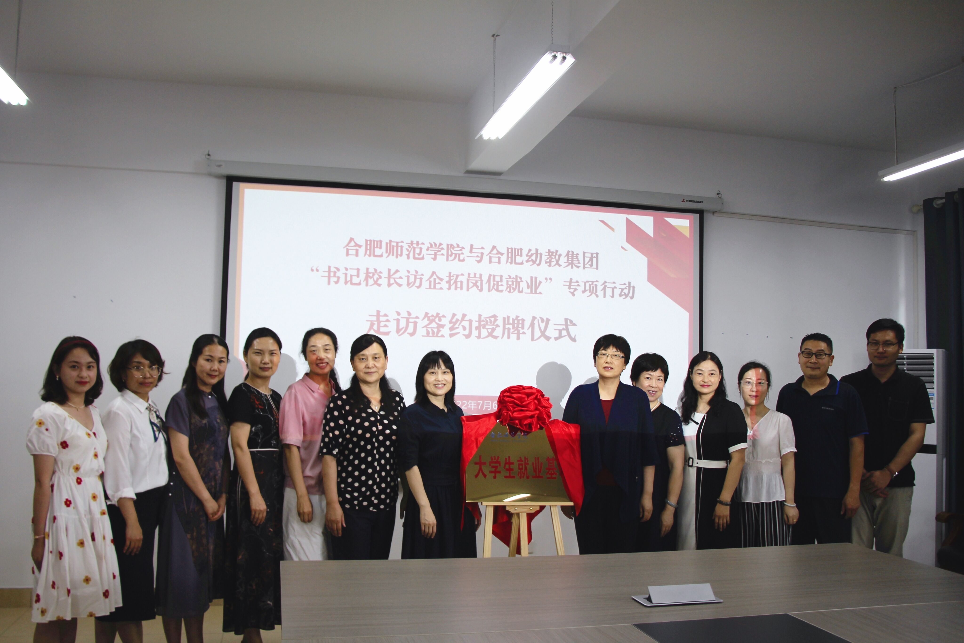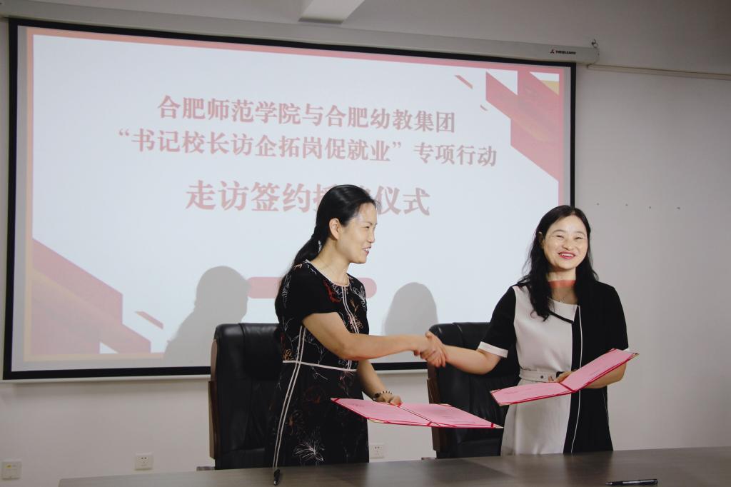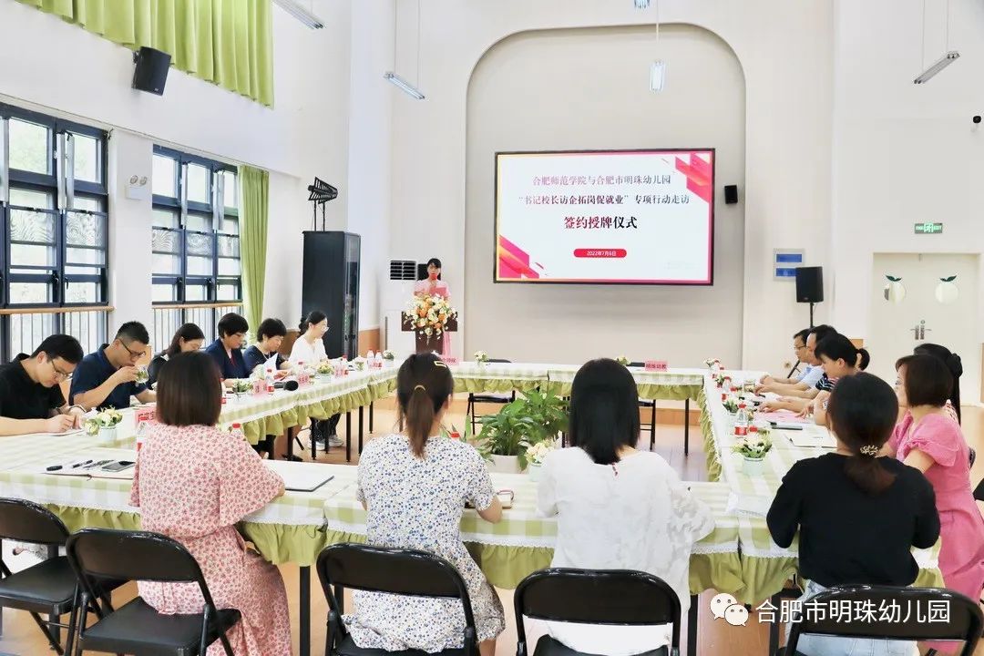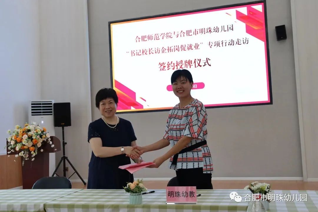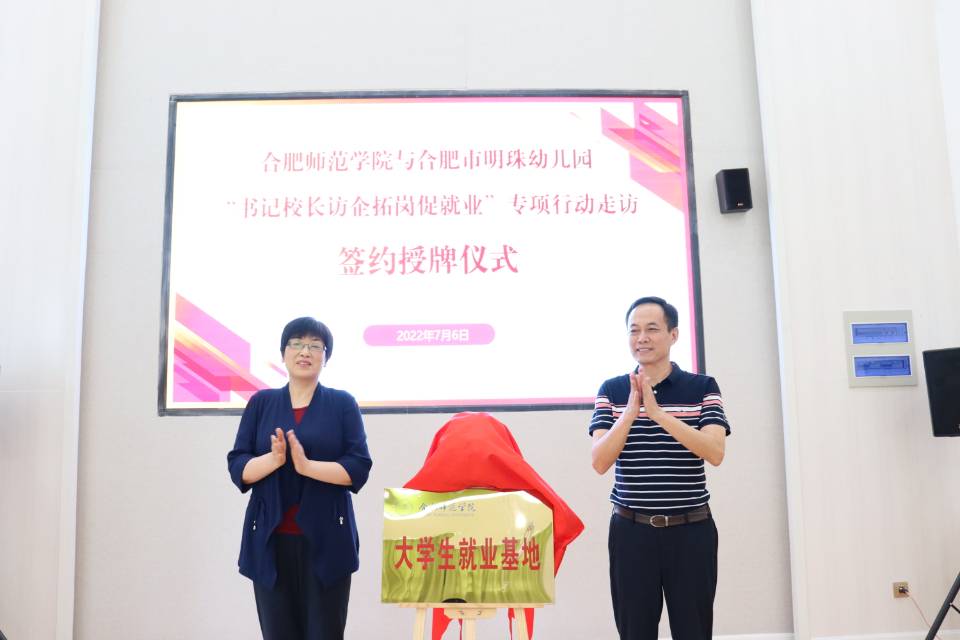 在签约授牌仪式上,方东玲、李丰尧为合肥市明珠幼儿园大学生就业基地揭牌,李群、周盼盼签署了合作协议。方东玲、余桂东为合肥幼教集团大学生就业基地揭牌,穆娟、刘朝阳签署了合作协议。(教师教育学院)