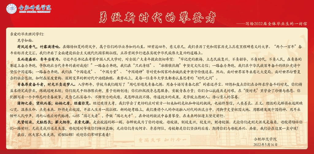 学生工作处撰写《致2022届全体毕业生的一封信》,勉励同学们要牢记党的教诲,立志民族复兴,不负韶华,不负时代,不负人民,在青春的赛道上奋力奔跑,争取跑出当代青年的最好成绩;组织全体毕业班辅导员录制毕业寄语微视频,发布在学校官方抖音号上,表达对毕业生的依依不舍之情与殷切期望;组织毕业生通过今日校园、微信等新媒体平台表达对母校的祝愿,对老师、学校、学弟学妹的感思、不舍之情,营造和谐有序、积极向上的毕业氛围,努力为每一位毕业生留下最美的“合师印记”。