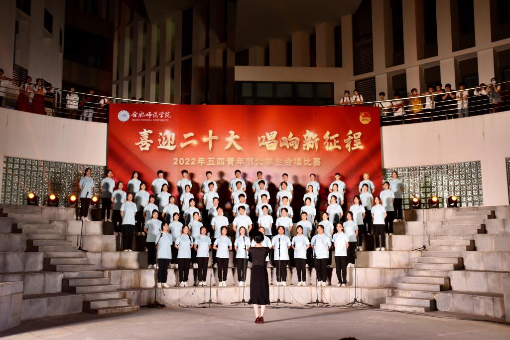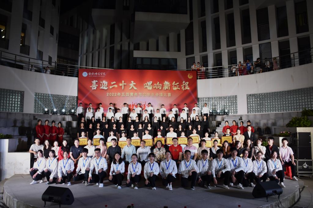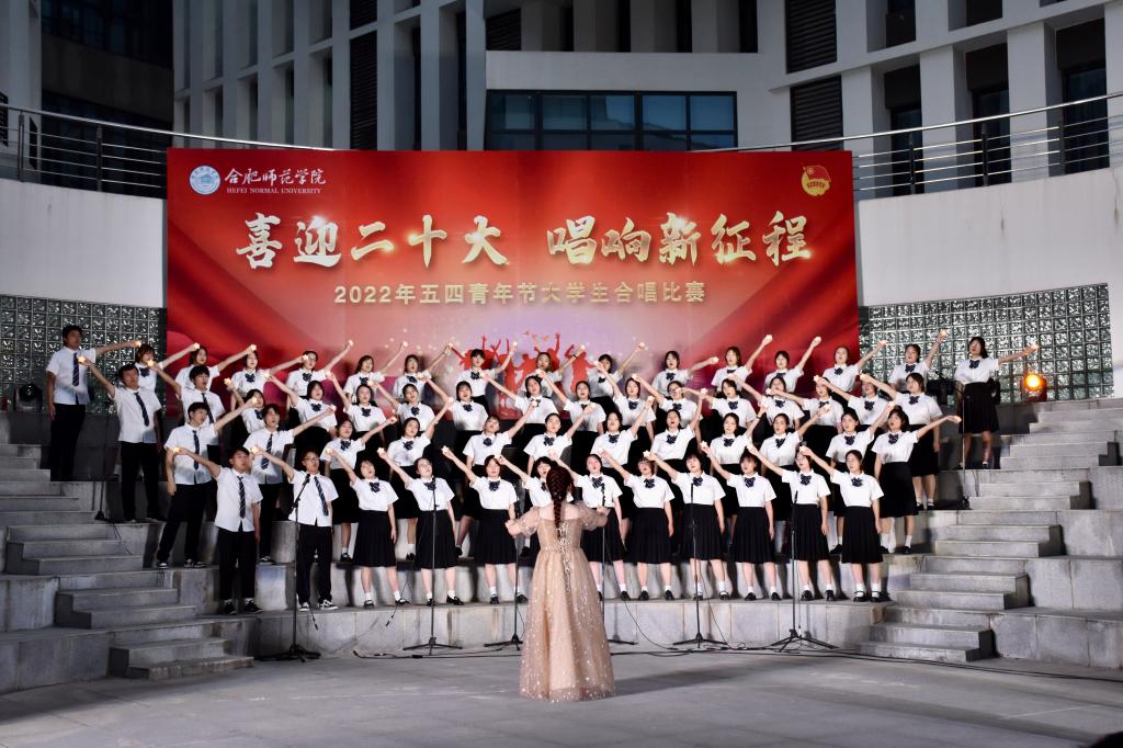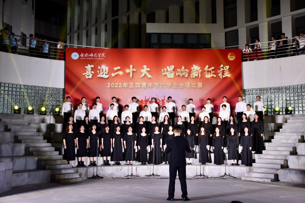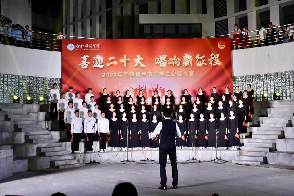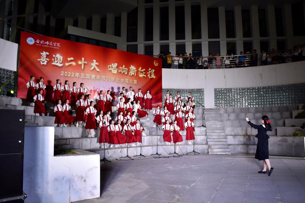 本网讯 为迎接党的二十大胜利召开,深入推进“喜迎二十大、永远跟党走、奋进新征程”主题教育实践活动,5月8日晚上,由院团委主办的“喜迎二十大 唱响新征程”五四大学生合唱比赛在滨湖校区举行。研究生处处长胡玉娟、院团委副书记刁文彬、外国语学院党委副书记马喆、马克思主义学院组织员束道锋,各二级学院团组织书记、各参赛学院指导老师及学生代表等400余人到场观看。音乐学院教师苏丽丽、谢梦珂、谭映、潘怡担任比赛评委。