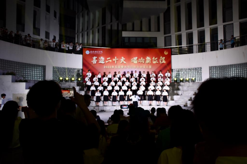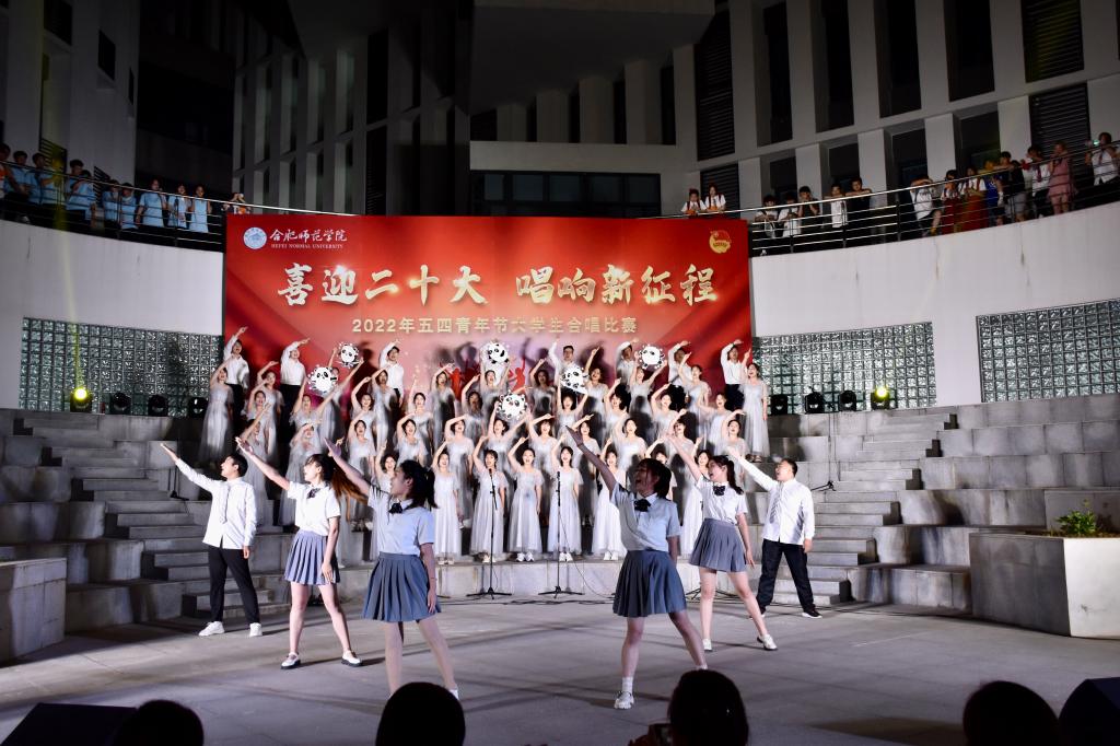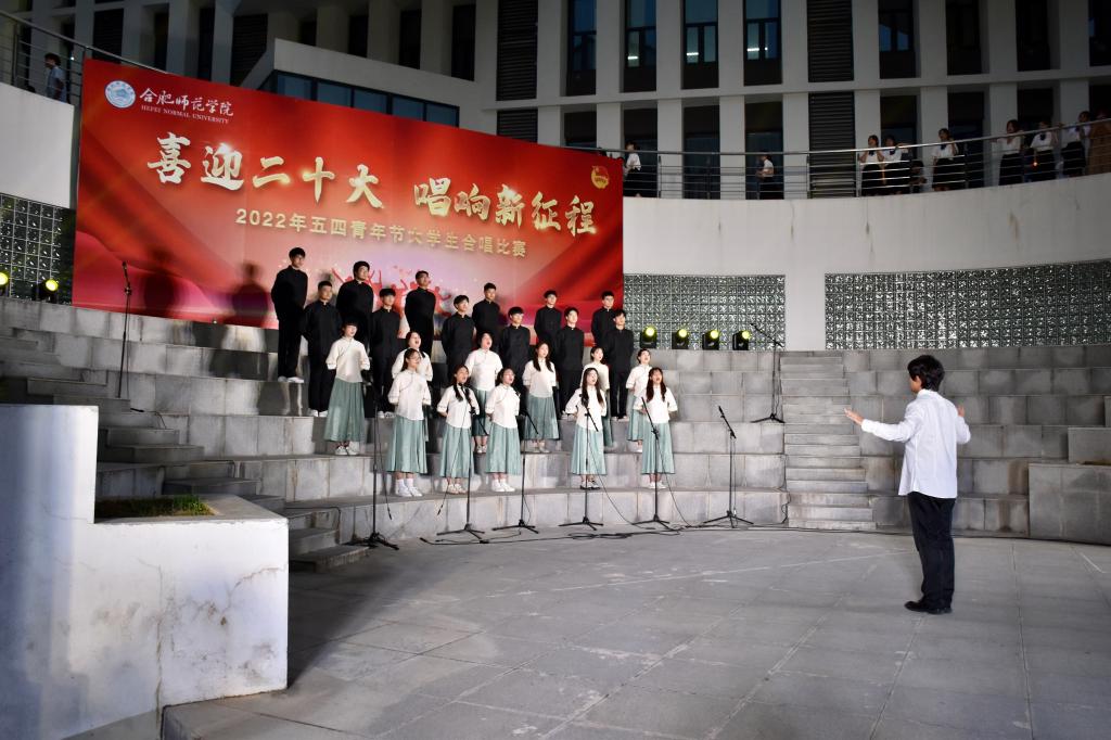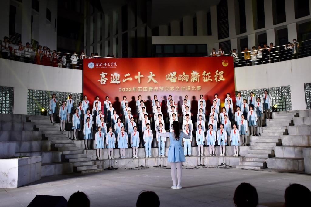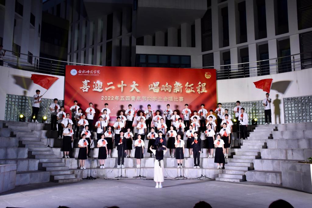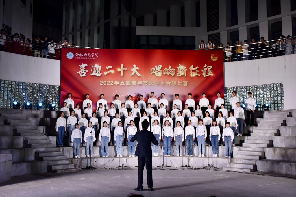本网讯 为迎接党的二十大胜利召开,深入推进“喜迎二十大、永远跟党走、奋进新征程”主题教育实践活动,5月8日晚上,由院团委主办的“喜迎二十大 唱响新征程”五四大学生合唱比赛在滨湖校区举行。研究生处处长胡玉娟、院团委副书记刁文彬、外国语学院党委副书记马喆、马克思主义学院组织员束道锋,各二级学院团组织书记、各参赛学院指导老师及学生代表等400余人到场观看。音乐学院教师苏丽丽、谢梦珂、谭映、潘怡担任比赛评委。