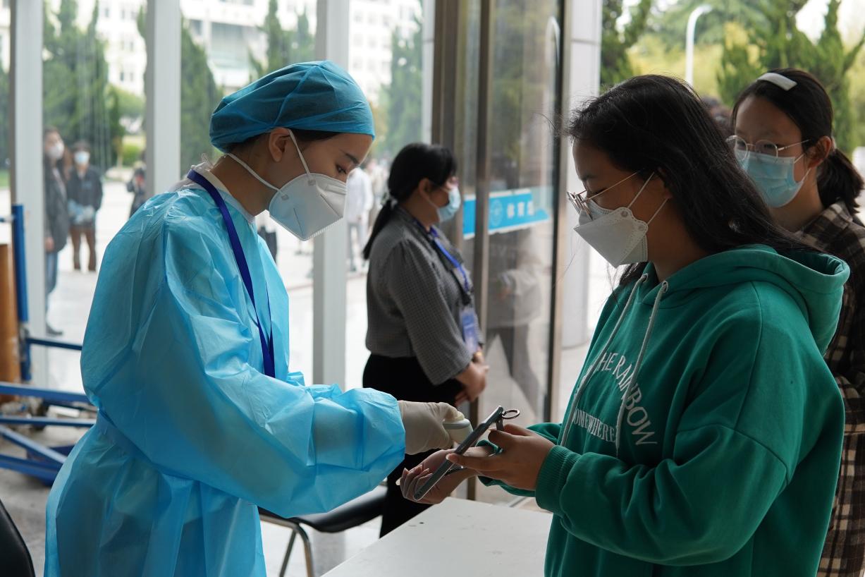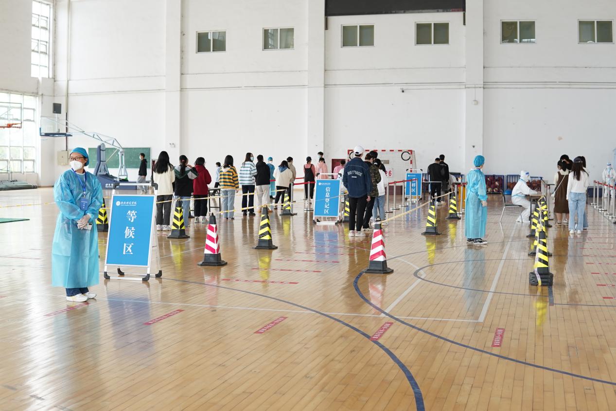 学院在锦绣校区体育馆和田径运动场、滨湖校区博学楼北广场等校园核酸检测指定区域设置演练检测点8个,并配套设置测温区、信息登记区、采样区、缓冲区、医疗废物暂存区、临时隔离区等多个功能分区。工作人员身着防护服、隔离衣,佩戴口罩、帽子、手套、面屏、护目镜,模拟实际工作场景在指定区域待命。学生代表提前准备好健康码和行程码,在工作人员引导下,测温后进入信息登记区,并保持1米间距,分组进入采样区,由医务人员逐一进行核酸采样,最后进行环境消杀。演练过程严格按照核酸检测流程规范操作,各工作组人员分工明确、响应迅速、配合密切、运转高效,现场井然有序。