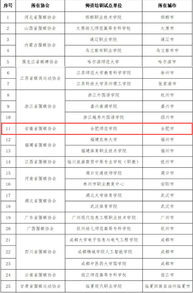 本网讯 近日,中国围棋协会发布《中国围棋协会关于第三批全国围棋师资培训试点单位的公示》,我院获批第三批全国围棋师资培训试点单位。本次试点单位涉及全国16个省25所院校,我院是安徽省唯一一所入选高校。