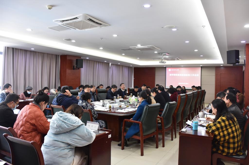 本网讯 2月25日上午,学院在行知楼第二会议室召开新学期党建和思想政治工作会议。院党委书记徐成钢出席会议并讲话,各二级党组织书记、专职副书记、党建组织员,组织部、办公室、纪委办、宣传部、学生工作部、保卫处等部门负责人参加会议。会议由院党委副书记吴昕春主持。