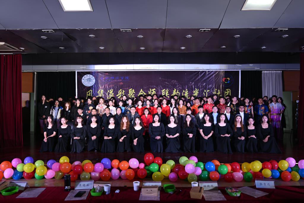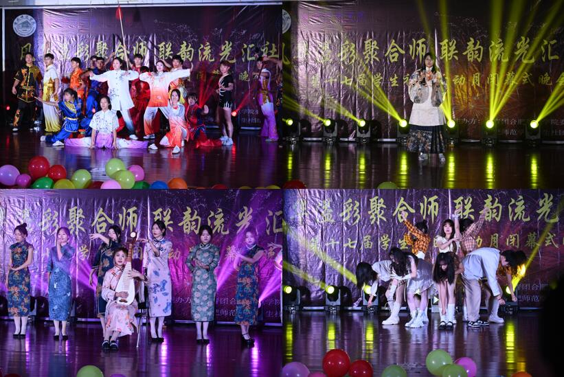 晚会以“风华溢彩聚合师,联韵流光汇社团”为主题正式拉开序幕。青春热血在这里挥洒,年轻的心在这里碰撞,各个社团大显身手——大学生艺术社团的舞蹈《东方红》生动形象的展示了中华民族艰苦卓绝的奋斗史,直击人心;思乡绵绵,情谊浓浓,梨花雨读书社表演的幕布剧《家,永远的港湾》为我们的内心带来宁静,为漂泊的灵魂带来抚慰;羽毛球协会的Kpop舞蹈《I can't stop me》用炙热的舞姿流露语言无法表达的情感,成功点燃现场氛围;文艺赏馨曲艺社表演的相声《校园生活》生动活泼,令在场的观众捧腹大笑;沧海桑田,千秋星河,满腔赤诚为利剑,艺韵音乐社带来的歌曲《千秋令》告诉我们春风比肩,何惧向人间……一共10个各具特色的节目组成晚会,现场座无虚席,台上社团成员们挥洒汗水,台下观众们回应以热烈的掌声。