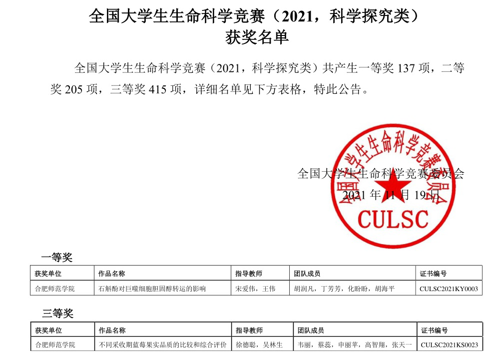 本网讯 近日,2021年全国大学生生命科学竞赛决赛落下帷幕。经过网评、省赛和国赛三个环节,由我院生命科学学院王伟和宋爱伟老师指导,胡润凡、丁芳芳、化盼盼和胡海平同学参加的《石斛酚对巨噬细胞胆固醇转运的影响》荣获一等奖(科学探究类国赛最高奖项);由沈章军和徐德聪老师指导,杜荣荣、张帅、张舒畅、郑颜晨、高潇和季涛涛同学参加的《优创·荟民》荣获二等奖(创新创业类);由徐德聪和吴林生老师指导,韦丽、蔡蕊、申丽苹、高智翔和张天一同学参加的《不同采收期蓝莓果实品质的比较和综合评价》获得三等奖(科学探究类)。本次比赛为我院参加全国大学生生命科学竞赛以来历史最好成绩,生科学子再一次用知识和智慧交出了一份靓丽答卷。