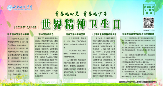 学生工作处心理健康教育中心在锦绣校区食堂前广场与滨湖校区博学楼前,以摆放大型展板的方式进行为期五天精神卫生知识宣传,详细介绍了“精神卫生日”来源与“精神卫生”的概念、常见卫生问题、应对方式,吸引大批学生驻足观看。同时以微信公众号为依托,发布精神卫生科普视频,增强同学们对精神卫生健康知识的理解。
