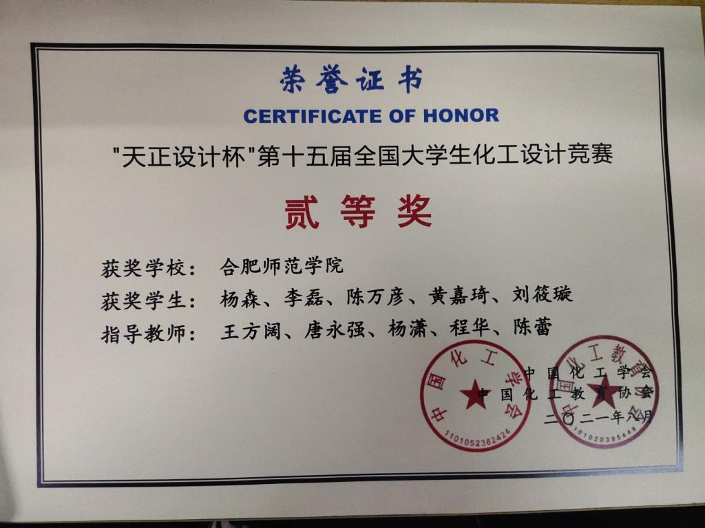 本网讯 近日,由中国化工学会和中国化工教育协会主办的“天正设计杯”第十五届全国大学生化工设计竞赛公布了获奖结果,我院学子喜获佳绩:“醇香悠长”团队(成员:杨森、李磊、陈万彦、黄嘉琦、刘筱璇,指导教师:王方阔、唐永强、杨潇、程华、陈蕾)荣获全国二等奖,“one shot”团队(成员:张治国、刘哲、邹子涵、齐肖雨、王佳,指导教师:袁新松、张琪、康烨、李亮)荣获华中赛区二等奖。