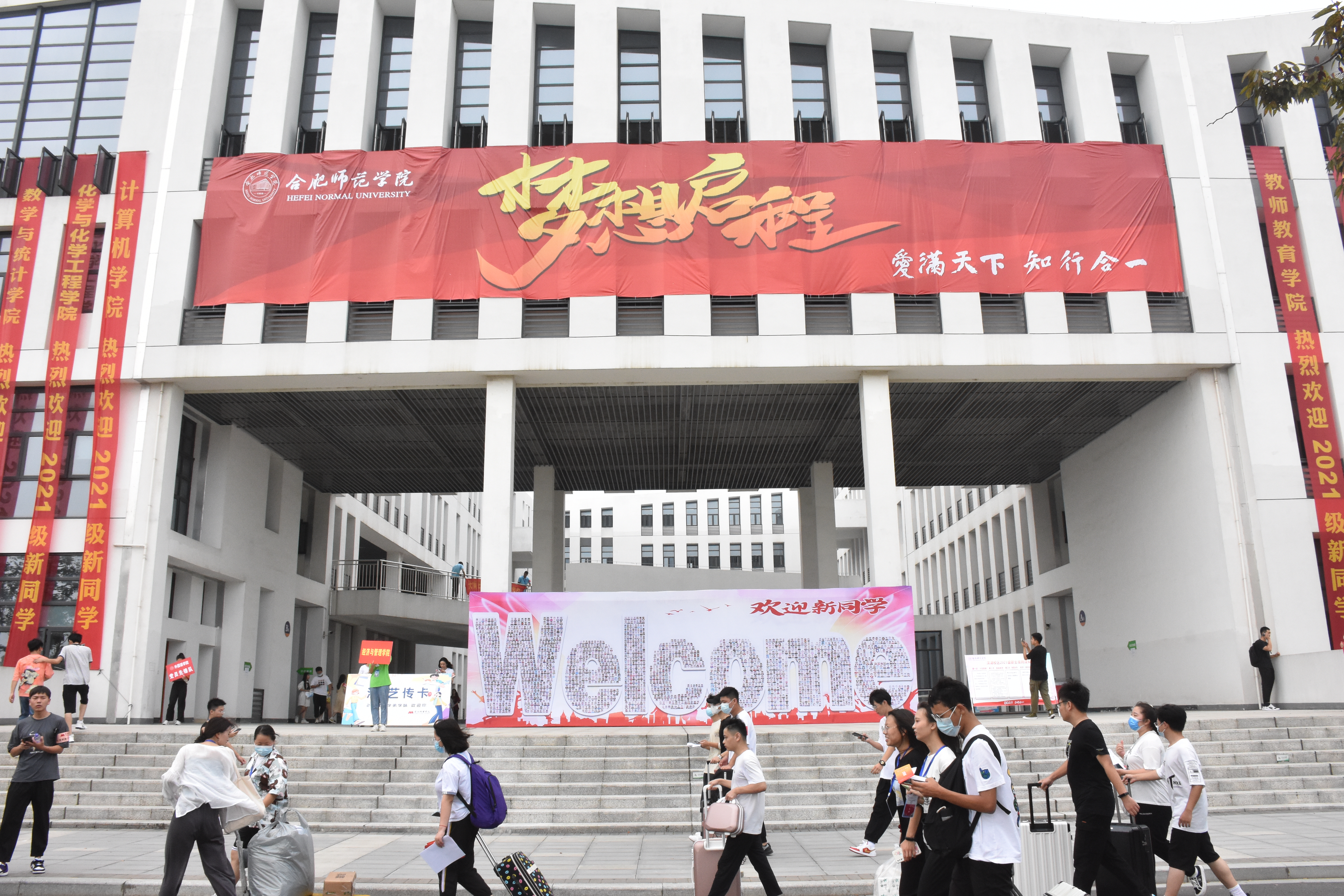 本网讯 秋风送爽,暑气渐消。9月4日,我院滨湖校区、锦绣校区迎来一批崭新的面孔,3500余名学子怀揣着青春梦想和对未来的期许,在这里扬帆启航,逐梦合师。“接过你的行囊,我们就是合师人”。校园内耸立的迎新“拱门”,随处可见的欢迎横幅、迎新帐篷,高高举起的指示牌,丰富多彩的展板共同营造出喜迎新同学的热烈氛围。