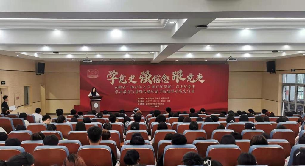 本网讯 为进一步深入学习贯彻习近平总书记在党史学习教育动员大会上的重要讲话精神,引导广大青年学生学党史、悟思想,进一步坚定理想信念,坚定不移听党话、跟党走。6月23日下午,“扬青年之声 颂百年华诞”安徽省青少年党史学习教育宣讲暨beat365唯一官方网站辅导员党史宣讲在学校锦绣校区学术报告厅举行。团省委副书记郑兰荣、二级巡视员李丹云、宣传部部长方芳,学校学生工作处处长陆涛、刘铭传学院院长管琳、团委副书记刁文彬、学生工作处副处长刘艳出席,各二级学院辅导员代表和学生代表近300人共同聆听宣讲会。宣讲会由辅导员协会秘书长、音乐学院辅导员许曦主持。