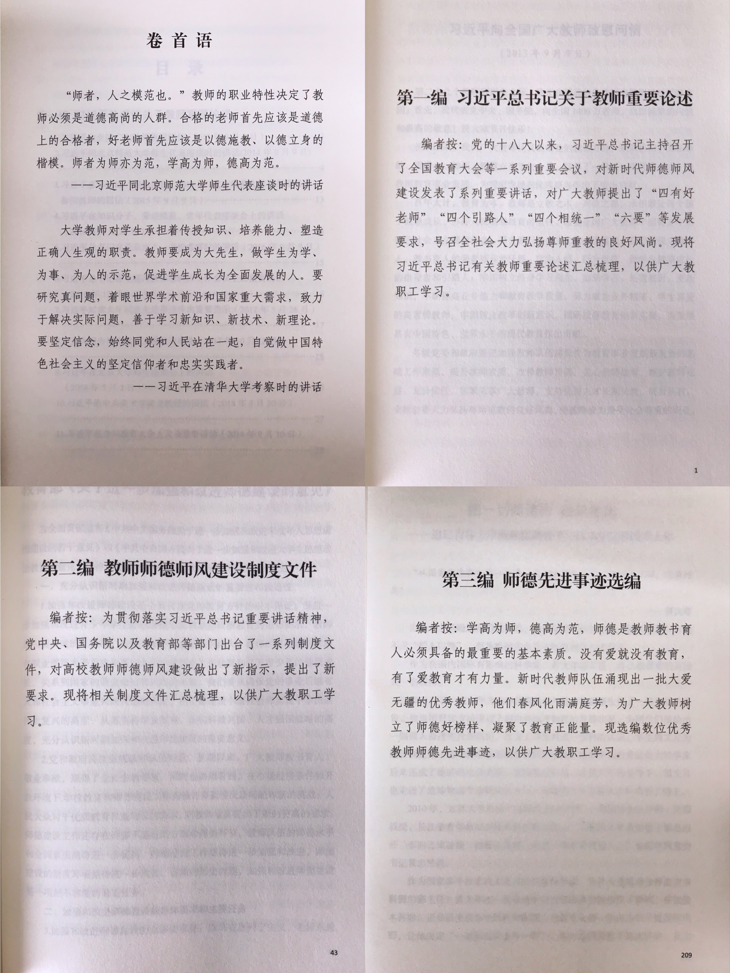 《教育读本》分为三个部分,第一编是习近平总书记关于师德师风的重要论述,第二编是国家、安徽省和学校关于师德师风建设的制度文件,第三编是师德师风先进典型事迹。