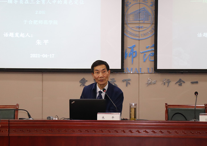 本网讯 4月16日,安徽师范大学朱平教授应邀为我院第十九期辅导员培训班,作“辅导员在三全育人中的角色定位”的专题讲座,讲座由学生工作处处长陆涛主持。