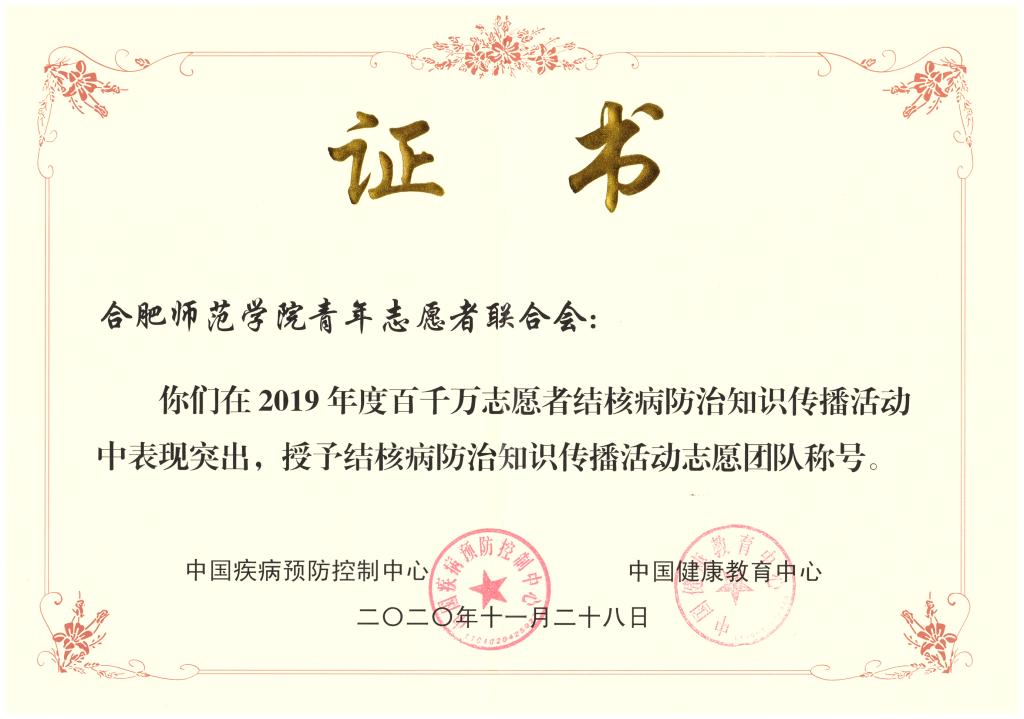 本网讯 近日,中国疾病预防控制中心公布了国家级和省级“百千万志愿者结核病防治知识传播活动”优秀志愿者团体、优秀志愿者获奖名单,我校青年志愿者联合会(以下简称“青志联”)荣获国家级“结核病防治知识传播活动志愿团队”称号。