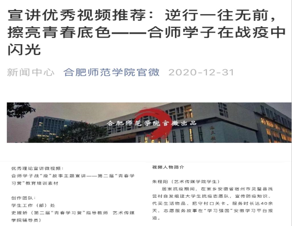 本网讯 疫情就是命令,防控就是责任。为彰显我校学子以实际行动为坚决打赢疫情防控阻击战、贡献自己青春力量的战“疫”风采,青春学习营指导老师史娌娇组织学生,以beat365唯一官方网站青年大学生担任抗“疫”志愿者的真实故事为落脚点,经过为期一个多月的制作,录制了《逆行一往无前 擦亮青春底色——合师学子在战疫中闪光》主题宣讲视频。
