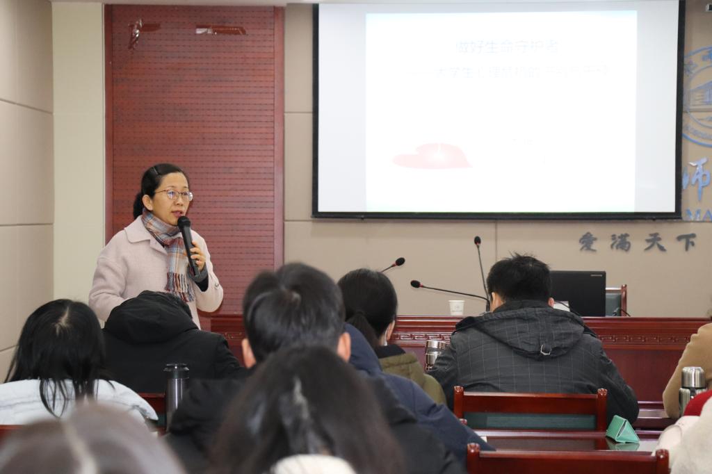 本网讯 为进一步加强大学生心理健康教育工作,提升学工队伍心理危机干预工作水平,12月4日下午,学院在锦绣校区行知楼开展学工队伍心理危机干预专题培训。讲座题为“做好生命守护者—大学生心理危机的识别与干预”,由合肥工业大学食品与生物工程学院党委副书记(原大学生心理健康教育咨询中心主任)李艳主讲。各二级学院党委(党总支)副书记、专兼职辅导员、学生工作处工作人员参加培训。
