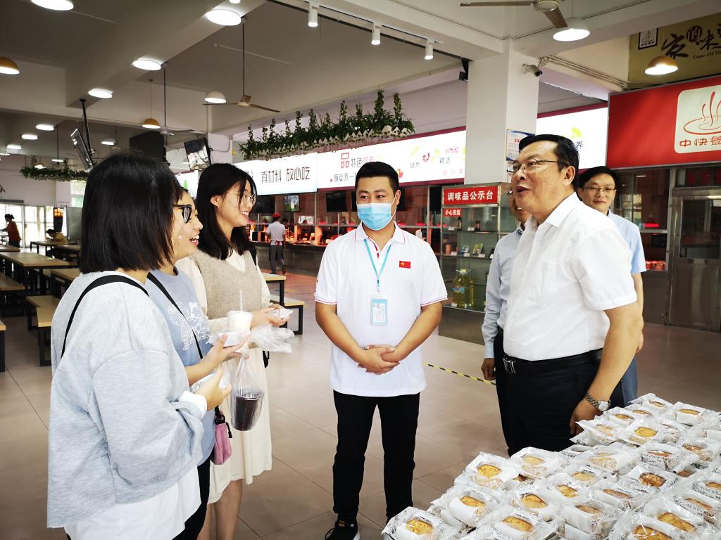 徐成钢一行先后实地查看了锦绣校区、滨湖校区的门卫岗亭、总值班室、食堂、医学隔离观察点、学生公寓等场所,与教职员工亲切交谈,详细了解中秋国庆假期期间安全保卫、值班值守、后勤保障、学生生活与学习、校园环境与卫生等情况,对他们的辛勤工作表示肯定,嘱咐大家注意休息、保重身体,并向他们致以节日的问候和祝福。