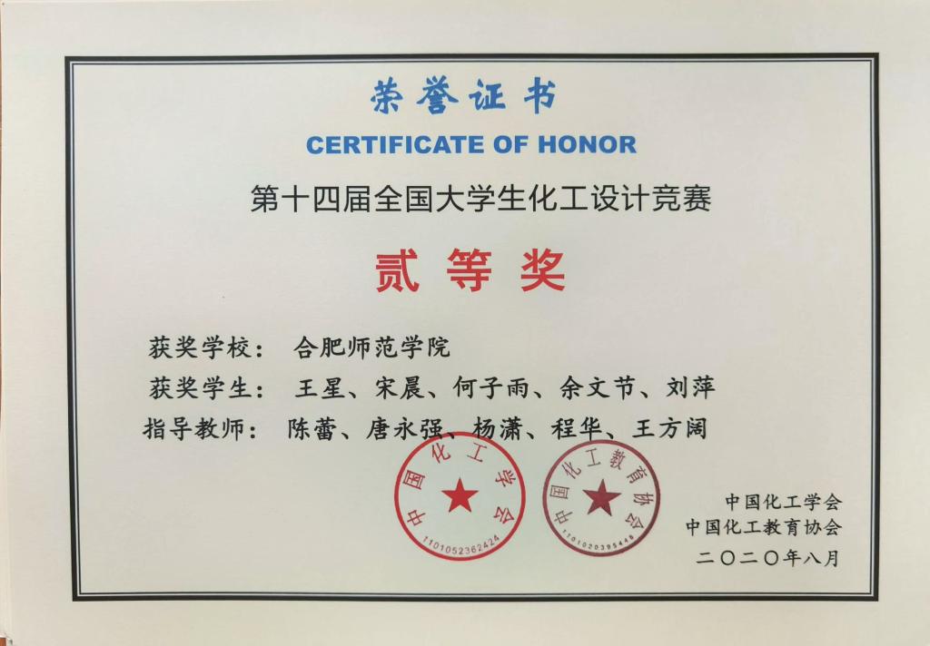 本网讯 近日,2020“东华科技杯”第十四届全国大学生化工设计竞赛落下帷幕,化学与化学工程学院学生王星、宋晨、何子雨、余文节、刘萍组成的“C位出道”队在本届比赛中荣获全国二等奖。