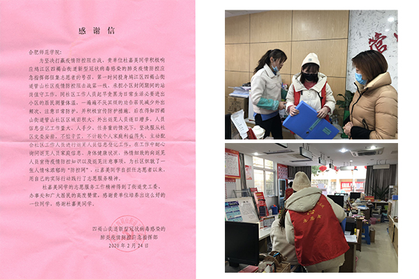本网讯 近日,学院收到一封来自中共鸠江区四褐山街道工作委员会的感谢信,信中对我院外国语学院学生杜嘉美积极参与社区疫情防控志愿服务提出表扬。