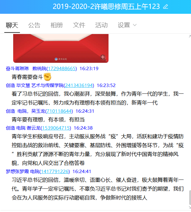 这次课上,我们共同学习了习近平总书记3月15日给北京大学援鄂医疗队全体90后党员的重要回信精神,大家畅所欲言,展开了青年责任与担当的讨论。
