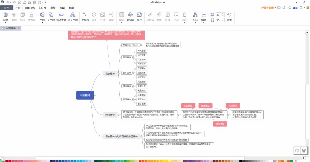 老师的网课利器之一是思维导图,利用MindMaster思维导图软件,让我们在课本中寻找出关键词、句,填充老师给出的思维结构图,将爱国主义为核心的民族精神与改革创新为核心的时代精神分为两条线路,在各种分支路线中填充具有时代特色的精神名称、抗疫过程中优秀人物。通过共同勾画思维导图与课前个人思维导图的训练,将民族精神与时代精神的内核与辨证统一关系展现的淋漓尽致。