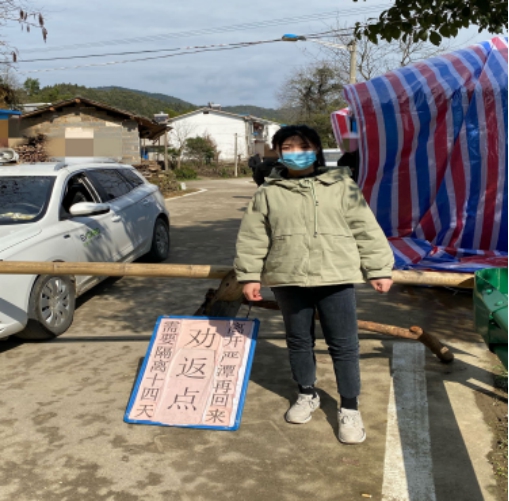疫情警报吹响了青春集结号。生命重于泰山,疫情就是命令,防控就是责任,来自外院的19级学子们也在疫情防控期间响应国家号召,积极行动,实现青春作为。疫情期间,2019级商务英语2班的王文倩参与了一支由党员带队、村民自发的志愿服务队。“为了劝阻过年期间亲友上门拜访以及村民频繁外出,我们的队伍在村路口严格把守,每天派六个人在村口站岗、执勤、巡逻,采用每天两班轮流工作制。”王文倩如是说。志愿服务期间,她主要负责登记出入人员的姓名和次数,配合参与志愿服务的共产党员们劝阻外来和无关人员出入村,并针对购买生活必需品的回村人员进行体温检测,严格控制疫情。