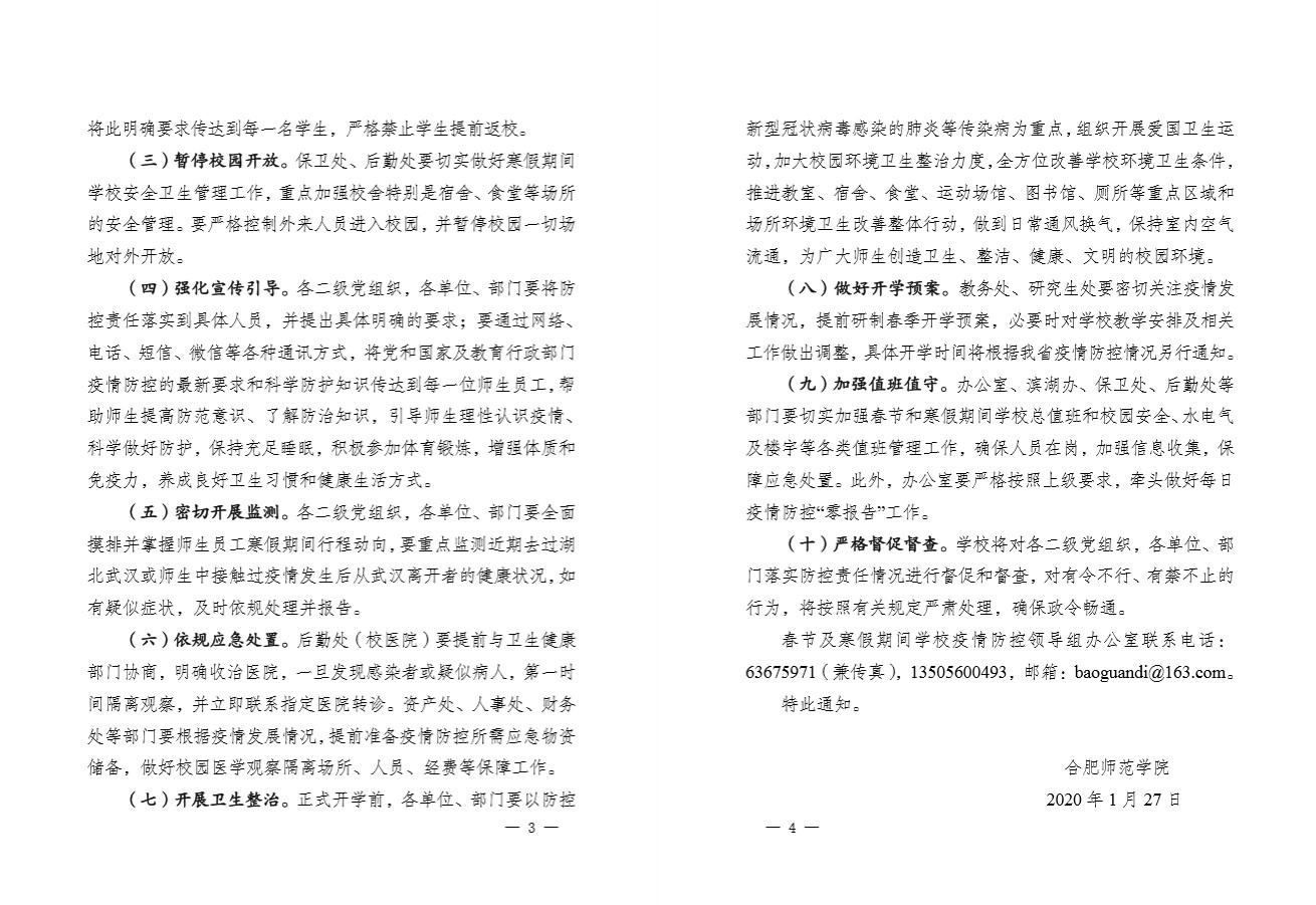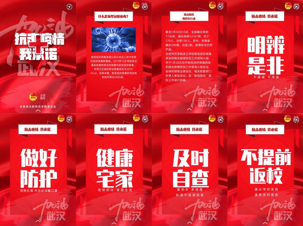 坚持科学防控,强化宣传引导。学校利用校园网、微信公众号、OA办公系统、学生及家长QQ群、电子屏等多种宣传载体,在全校悬挂疫情防控标语,张贴地方政府通告和公开信,开展团员青年“抗击疫情 你我同行 众志成城 武汉加油”网络承诺接力活动,向师生员工宣传普及疫情防治知识以及防控工作各项要求。学生处面向全体学生发出《给学生一封信》,宣传防控知识,引导学生做好自我防护。同时,组织教师教育学院心理学教师专业力量,编制发布《心理战“疫”,静候花开——应对新型冠状病毒肺炎疫情心理自助指南》,强化主动介入,引导师生员工科学理性认识疫情,切实增强师生员工的群防意识和自我防护能力,进一步增强师生员工抗击疫情的信心和决心。