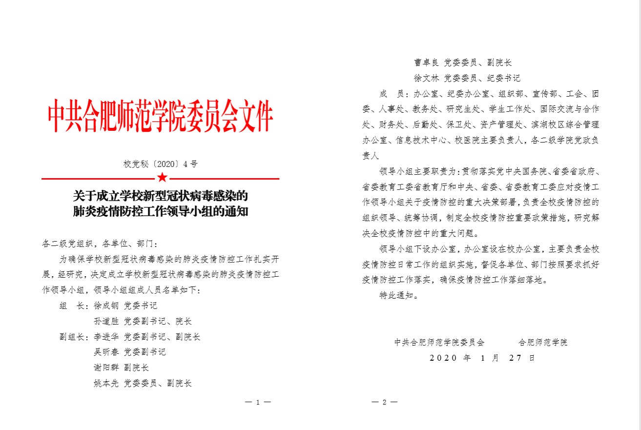 提高政治站位,强化思想共识。校党委第一时间组织专题学习传达习近平总书记在中央政治局常务委员会会议上的重要讲话、安徽省疫情防控工作电视电话会议以及省委教育工委省教育厅有关文件精神,明确要求全校各级党组织和广大党员干部深刻认识做好防控工作的极端重要性和现实紧迫性,树牢“人民利益高于一切”、“师生生命安全和身体健康是第一位”和“疫情就是命令,防控就是责任”的思想,从增强“四个意识”、坚定“四个自信”、做到“两个维护”的政治高度,不忘初心、牢记使命,以上率下、担当作为,切实把疫情防控工作作为当前最重要的工作来抓,团结带动师生员工把思想和行动统一到习近平总书记重要讲话精神和党中央重大决策部署上来,统一到安徽省有关会议文件精神要求上来。
