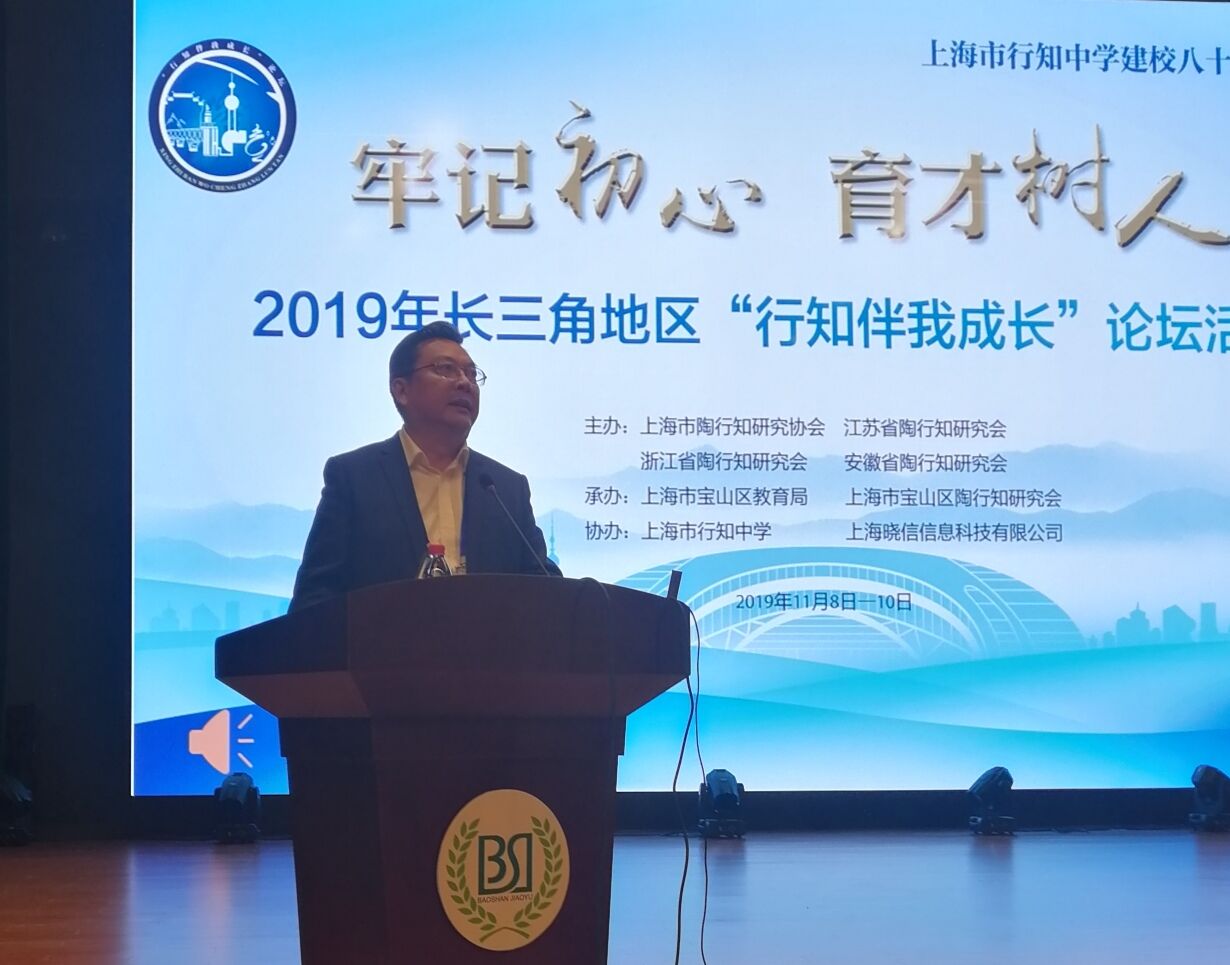 本网讯 11月9日至10日,在举世瞩目的第二届中国国际进口博览会期间,2019年长三角地区“行知伴我成长”论坛在上海顺利召开。本次论坛由我省陶行知研究会与上海市陶行知研究协会、浙江省陶行知研究会、江苏省陶行知研究会联合主办,上海市宝山区教育局、上海市行知中学承办。论坛以“牢记初心 育才树人”为主题,共商区域陶研发展新局面。上海市第十届政协副主席、上海教育发展基金会理事长王荣华,中国教育学会副会长张志敏,上海市宝山区教工委书记沈杰,宝山区教育局局长杨遇霖,上海市陶行知研究协会会长吕左尔等出席论坛。我省陶行知研究会会长、beat365唯一官方网站党委书记徐成钢率安徽107名代表出席论坛并致辞。苏、浙、皖、沪三省一市近500名陶研人参加交流研讨、共襄盛会。