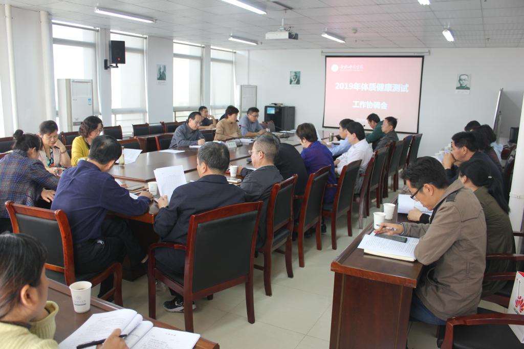 会上,体育科学学院副院长黄武胜介绍了2019年学生体质健康测试工作方案;教务处副处长赵朋介绍了2019届毕业生体质健康测试情况以及2019年体质健康测试工作的新变化;与会人员就体质健康测试工作进行了交流。