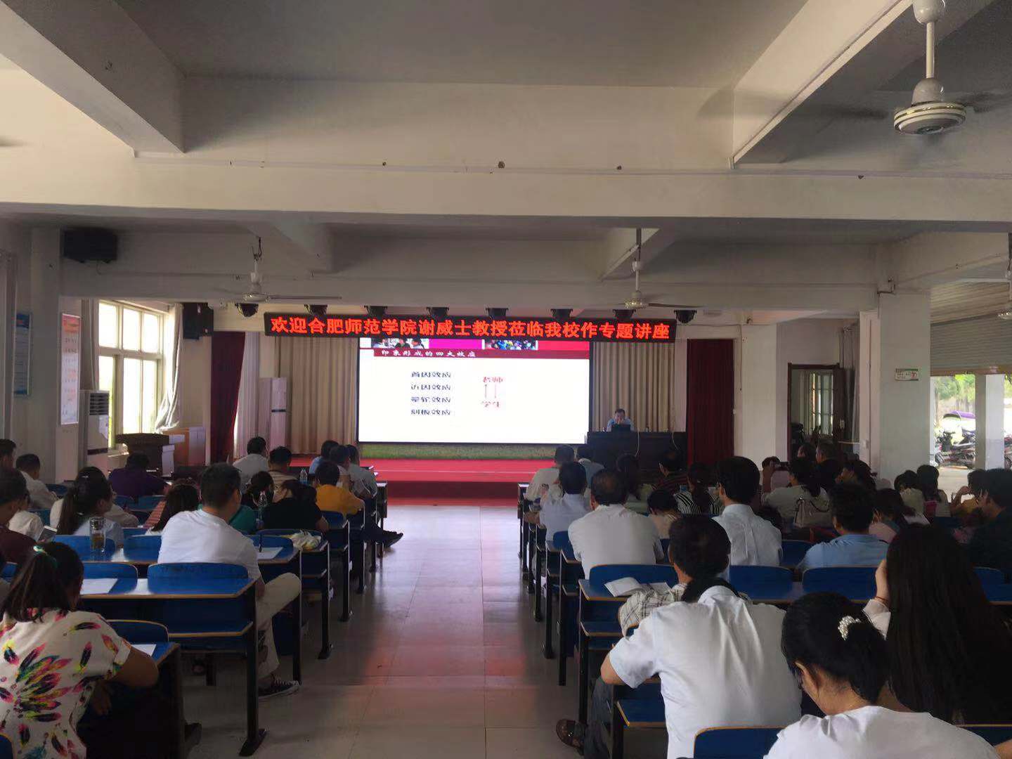 本网讯 为深入推进教育扶贫,发挥广大师生在脱贫攻坚中扶志扶智的重要作用,8月29日,我院组织教师教育学院副教授、硕士生导师谢威士赴扶贫帮扶点阜阳市颍东区口孜镇中心学校作题为“做一名幸福的老师——师生沟通的艺术”专题讲座,口孜镇中心学校300余名中小学教师、中心学校校长马文斌及全体驻村工作队成员到场聆听了讲座。